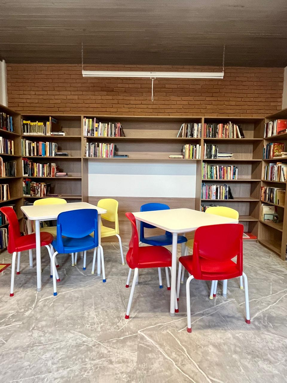 com capacidade máxima de: 06 mesas e 24 cadeiras 30 Estantes de madeira 02